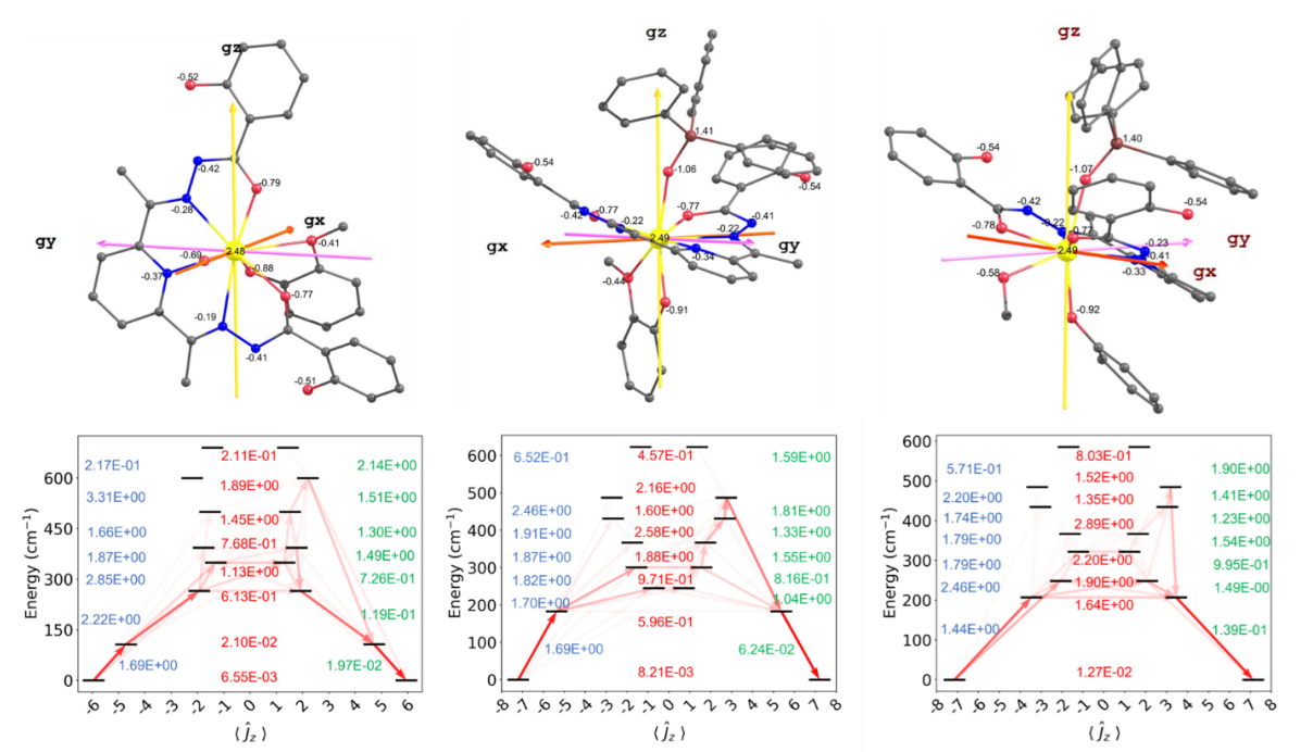 Abstract: A series of dimeric Dy2 complexes 1–3 was constructed using the 2,6-diacetylpyridine bis-salicyl hydrazone ligand system LN3O2 (provides equatorial N3O2 donor atoms) and linkers derived from hydrazine and vanillin (L1) or 4-hydroxybenzaldehyde (L2). These linkers coordinate from one of the axial sites of Dy(III) ions, and the other axial sites can be occupied by water or triphenylphosphine oxide (TPPO). Single crystal X-ray diffraction data reveal the molecular formulae of [Dy2 (H2LN3O2)2(L1)(H2O)2], [Dy2(H2LN3O2)2(L1)(TPPO)2], [Dy2(H2LN3O2)2(L2)(PPh3O)2], respectively, for complexes 1–3. The field-induced slow-magnetic relaxation behavior was observed for all these complexes, with Orbach Ueff = 11 cm−1 (T0 = 2.0 × 10−5 s−1), Ueff = 12.5 cm−1 (T0 = 7.9 × 10−6 s−1) and Ueff = 7.65 cm−1 (T0 = 9 × 10−5 s−1) and dominating Raman magnetic relaxation processes. Ab initio theoretical studies were performed on the optimized X-ray structures of these complexes to rationalize the experimental observations.