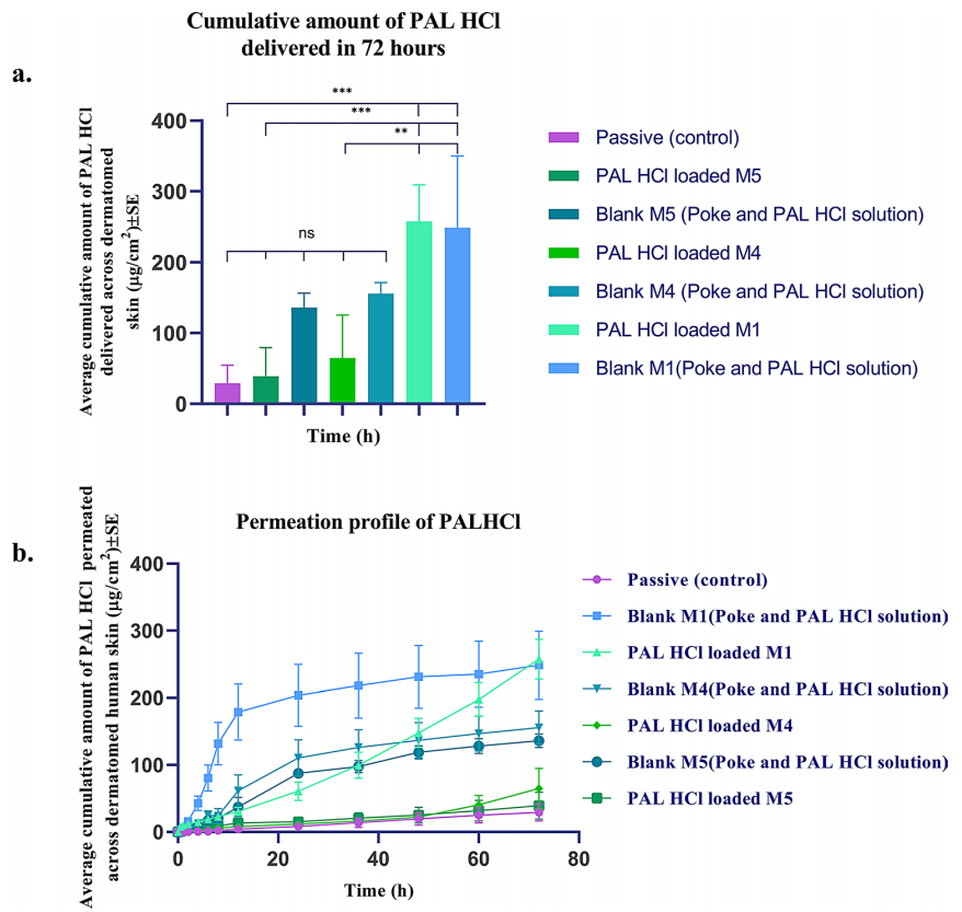 Abstract: This study introduces vacuum compression molding (VCM) as a novel, solvent-free method for fabricating palonosetron hydrochloride (PAL HCl)-loaded polyvinyl alcohol (PVA) microneedles (MNs), addressing limitations of conventional micromolding such as extended drying times, batch variability, and solvent residues. PAL HCl-a hydrophilic 5-HT3 receptor antagonist (MW: 332.85 g/mol) with a low therapeutic dose-was selected for its clinical relevance in managing chemotherapy-induced nausea and vomiting (CINV). The microneedle platform offers advantages over PAL HCl’s existing oral and injectable dosage forms, including pain-free application and improved patient compliance. The aim of this research is to develop and evaluate a scalable VCM-based fabrication approach for PAL HCl-loaded PVA microneedles, with the goal of achieving sustained, three-day in vitro transdermal drug delivery for improved CINV management. Ten PVA grades (varying in molecular weight and viscosity) were screened to optimize microneedle fabrication. Three formulations-M1 (particle-engineered PVA 4–88), M4 (PVA 5–88), and M5 (PVA 8–88)-demonstrated optimal mechanical strength, uniform geometry (SEM imaging), and reliable skin penetration (~ 200 μm depth in dermatomed human skin). Physicochemical characterization (FTIR, DSC) confirmed the amorphous state of PAL HCl within the PVA matrix and the absence of chemical interactions. In vitro release testing revealed biphasic profiles: an initial burst release for 8 h followed by sustained release over 72 h. Cumulative release inversely correlated with PVA molecular weight and viscosity, with M1 achieving 100% release, compared to M4 (74%) and M5 (67%). Permeation studies demonstrated M1’s superior performance (257.56 ± 29.73 µg/sq cm), exceeding passive diffusion by 8.8-fold and significantly outperforming M4 (64.99 ± 30.23 µg/ sq cm) and M5 (39.03 ± 20.20 µg/sq cm). These results validate VCM as a scalable, tunable platform for fabricating PAL HCl-drug-loaded microneedles, offering sustained transdermal delivery with clinical potential for CINV management.