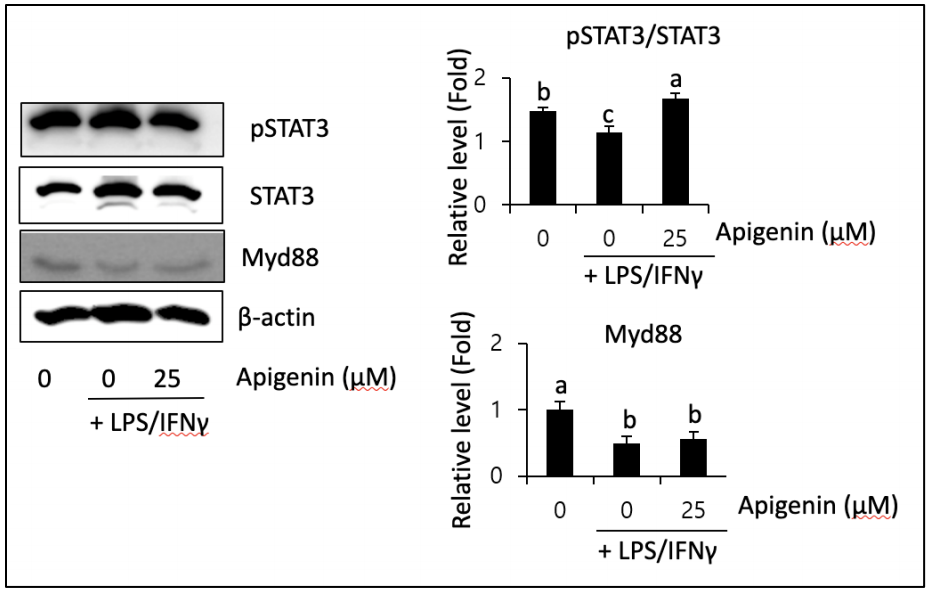 Abstract: Colorectal cancer is one of the most fatal diseases in the United States. Chronic tissue inflammation can cause cell proliferation, which leads to tumor formation and cancer development. Macrophages are responsible for maintaining tissue homeostasis for inflammatory responses. M1 macrophages exhibit proinflammatory responses while M2 macrophages exhibit anti-inflammatory responses. Imbalance between M1 and M2 macrophages is closely related to inflammation-associated disease development. The anti-inflammatory effects of apiaceous vegetable constituents, specifically flavonoids, have been studied for their preventative effects towards reducing disease risk. However, sufficient evidence is lacking on the mechanisms by which flavonoids impact M1/M2 macrophage polarization. RAW 264.7 cells were pre-treated with apigenin for 2 hr prior to applying lipopolysaccharide (LPS) and interferon γ (IFNγ) for M1 macrophage polarization or interlukin-4 (IL-4) for M2 macrophage polarization. After 22-hr incubation, culture media was used for nitric oxide (NO) quantification, and the cells were used to quantify gene expression, and the expression and nuclear translocation of proteins. We screened nine polyphenols for their effect on NO production in M1 macrophages. Among them, apigenin was the most effective in reducing NO production in LPS/IFNγ-induced M1 macrophages. Apigenin downregulated mRNA expression of M1-related genes including TNFα, CD86, and IL-6 in M1 macrophages but had no effect on IL-1β and iNOS. Apigenin reduced IL-6 and IL-10 cytokine production in LPS/IFNγ-induced macrophages but had no effect on IL-1β and TNFα. Apigenin did not induce M2 marker genes such as CD163, CD206, and IL-10 in M1 macrophages, which indicates apigenin does not repolarize M1 macrophage toward M2 macrophage. Apigenin also suppressed M2 macrophage polarization by downregulating M2 gene expression of Arg-1, CD206, and IL-13 in IL-4 induced M2 macrophages. Apigenin suppressed M1 macrophage polarization by inhibiting phosphorylation of p65 and STAT1, downstream targets of LPS and IFNγ respectively. These are major transcription factors regulating M1 macrophage polarization. Although nuclear translocation of p65 was not influenced, apigenin inhibited NF-κB transcriptional activity. Taken together, apigenin inhibited M1 macrophage polarization through suppression of LPS/IFNγ signal transduction, implying that apigenin could be a promising anti-inflammatory polyphenol for preventing inflammation-associated diseases and might play a critical role in colon cancer development.