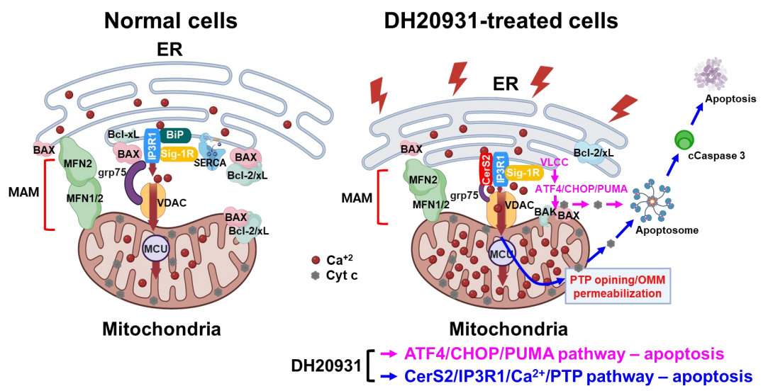 Abstract: Triple-negative breast cancer (TNBC) remains a significant clinical challenge due to its aggressive nature and lack of effective targeted therapies. The enzyme ceramide synthase 2 (CerS2), which synthesizes pro-apoptotic very long-chain ceramides (VLCCs), represents a promising therapeutic target. Here, we identify and characterize DH20931, a novel, first-in-class small-molecule agonist of CerS2. We demonstrate that DH20931 directly activates CerS2 with nanomolar potency, leading to significant VLCC accumulation in breast cancer cells. This lipotoxic event induces endoplasmic reticulum (ER) stress and triggers apoptosis via the canonical ATF4/CHOP/PUMA signaling pathway. Mechanistically, we uncover a novel interaction between CerS2 and the ER calcium channel, Inositol 1,4,5-trisphosphate receptor 1 (IP3R1). We demonstrate that DH20931 promotes this interaction, enhancing ER-mitochondria proximity and facilitating a CerS2-dependent flux of calcium (Ca2+) from the ER into mitochondria. This subsequent mitochondrial Ca2+ overload serves as a critical trigger for apoptosis. In preclinical evaluations, DH20931 potently inhibited the growth of TNBC cells in 2D and 3D cultures and significantly suppressed tumor progression in orthotopic and patient-derived xenograft (PDX) models, all while exhibiting a favorable safety profile. Our findings validate CerS2 as a druggable target in TNBC and establish a novel therapeutic strategy that leverages a coordinated attack on cancer cells through ER stress and calciummediated mitochondrial dysfunction.