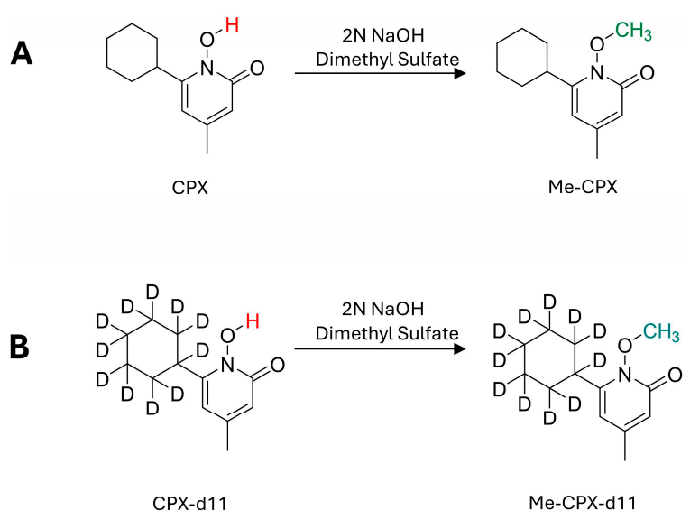 Abstract: Ciclopirox (CPX), a topical antifungal agent of the N-hydroxypyridone class, has gained renewed interest for its potential anticancer, antiviral, antibacterial, and neuroprotective effects. However, due to lack of reliable validated bioanalytical methods, current insights into its pharmacokinetics profile beyond topical use remain limited. To support therapeutic repurposing, we developed and validated a rapid, sensitive LC-MS/MS method for systemic pharmacokinetic evaluation in mice. The method employs methyl derivatization of CPX’s N-hydroxy group, producing methylated CPX (Me-CPX) for improved chromatographic performance which was subsequently retained on the AtlantisTM T3 C18 reverse phase column. Concentration of CPX is determined indirectly based on the measured response of Me-CPX. The method achieved excellent recovery, a 4-min rapid runtime, sensitivity with LLOQ of 3.906 nM (0.81 ng/mL), and a linear range up to 1000 nM (r ≥ 0.9998). All validation parameters including intra- and inter-day accuracy, precision, matrix effects, stability and dilution integrity met the criteria defined by regulatory International Council for Harmonisation (ICH) M10 bioanalytical method validation guidelines. Application of the method to in vitro plasma protein binding studies revealed high protein binding (>99%) of CPX in both human and mice plasma. Preliminary PK analysis following intravenous and oral administration in CD-1 mice demonstrated moderate systemic exposure after oral dosing, with an estimated absolute bioavailability of 52.5%. These findings establish the method’s suitability and robustness for preclinical and future clinical development of CPX as a repurposed therapeutic agent.