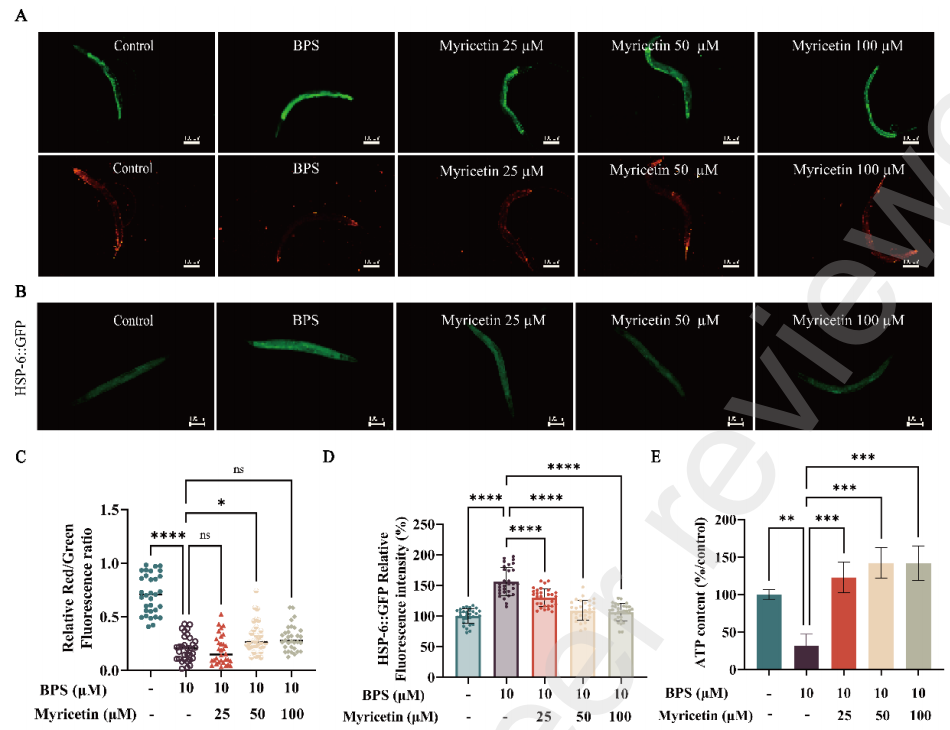 Abstract: Bisphenol S (BPS) is increasingly used as a substitute for BPA, but has raised serious concerns due to its environmental persistence and potential health risks. In this study, environmental exposure to BPS results in significant bioaccumulation and induces oxidative stress and lipid metabolic disturbances in Caenorhabditis elegans have been demonstrated firstly. Importantly, we identify myricetin, a natural flavonoid, as an effective protective agent that mitigates BPS-induced toxicity. Mechanistically, this study revealed that myricetin alleviates BPS-induced toxicity through a synergistic "dual-pathway" mechanism involving the regulation of both the AMPK/FOXO and AMPK/mTOR signaling pathways firstly. Specifically, myricetin upregulates the energy sensor aak-2, thereby activating the AMPK/FOXO cascade, which promotes autophagy via increased lgg-1 expression and facilitates the nuclear translocation of the transcription factor daf-16. This leads to the transcriptional upregulation of downstream antioxidant defense genes (sod-3, ctl-2, gst-4) and the regulation of lipid metabolism through sbp-1. Concurrently, myricetin enhances autophagic flux via activation of the AMPK/mTOR pathway. Notably, the AMPK inhibitor compound C only partially suppresses these effects suggests the involvement of additional AMPK-independent mechanisms. These findings uncover a novel dual-pathway mechanism by which myricetin alleviates BPS toxicity and highlight the potential of natural compounds in mitigating environmental pollutant-induced metabolic disorders.