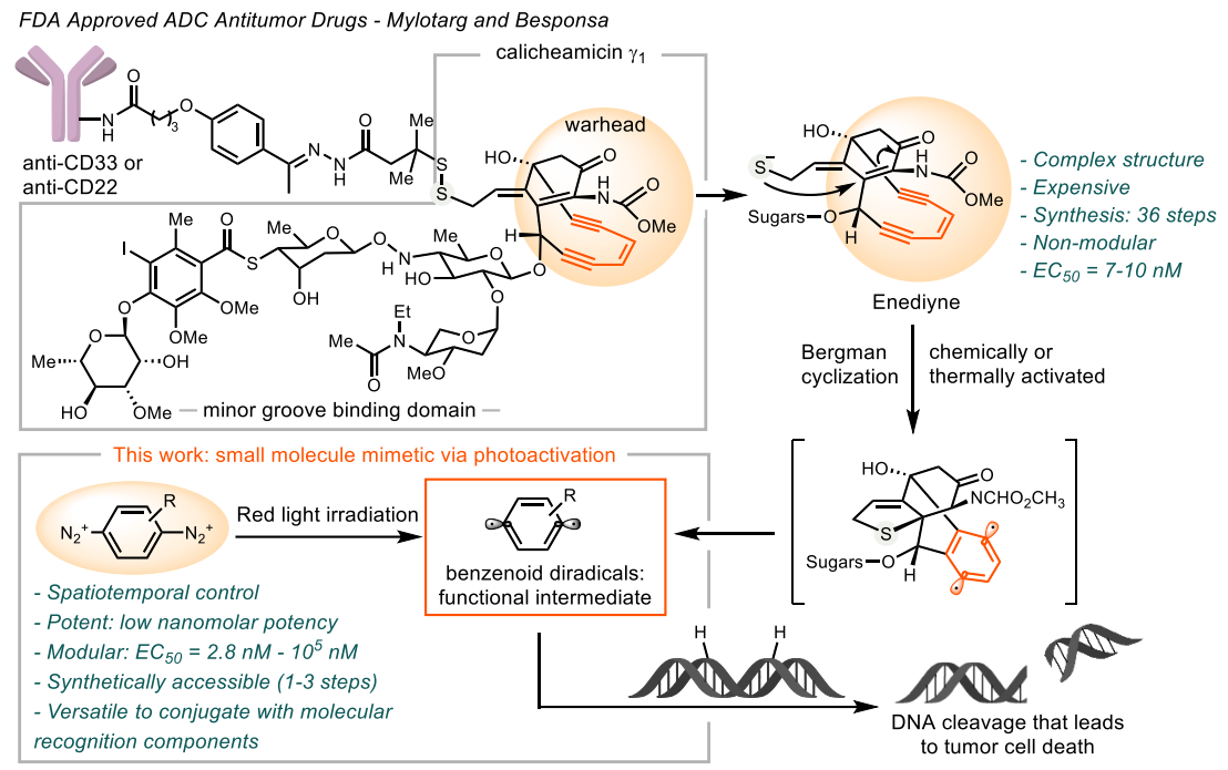 Abstract: The ability to modify DNA and functionalize proteins is a foundational tool in chemical biology, essential for probing complex biological systems and for engineering new or improvedfunctions at the molecular level. Such modifications enable researchers to track, visualize, and manipulate biomolecules of interest, enabling the development of targeted therapeutics, biosensors, and diagnostic assays. Photoredox chemistry, which operates under mild conditions and leverages light to achieve high spatiotemporal control, provides a powerful and biocompatible platform for these transformations in biologically relevant settings. The use of lower energy light, such as red or near-infrared light, further enhances this approach by minimizing phototoxicity and allowing deeper tissue penetration. These features make red-shifted photocatalysis an ideal platform for bioorthogonal modifications, expanding the toolkit for probing and manipulating biological systems. Towards this goal, this dissertation describes the use of innovative photocatalytic methods to modify and functionalize biologically relevant macromolecules. The research presented here describes the use of novel diazonium compounds along with red-shifted, low-energy light to perform modifications on DNA and proteins. The development of novel photoactivatable multi-diazonium compounds led to the effective and potent degradation of DNA under mild conditions utilizing only low energy light. The potency of this method was comparable to those of its natural counterparts, such as calicheamicin. Diazonium compounds offer a synthetically more accessible mimic of natural enediyne-containing DNA cleaving agents. This method provides a more cost-effective, efficient, and modular alternative to enediynes derivatives and offers the potential for enhanced specificity through spatiotemporal control. The photoactivatable nature of diazonium compounds was also harnessed for the photocatalytic labeling of proteins. “TagC-RED,” a Retro-Ene type sigmatropic rearrangement of Diazonium compounds for Cysteine-specific tagging, activated by near-infrared light (λ > 1000 nm), is also introduced and detailed in this report. TagC-RED is rapid, catalyst-free, compatible in cellular environments, and capable of penetrating tissues, making it suitable for intracellular labeling. This method holds significant potential as a platform for targeted protein labeling and real-time tracking of cellular processes. In parallel, foundational efforts to enable the specific spatiotemporal labeling of target sites on polynucleotides are also detailed here. Instead of the diazonium-mediated method used for light-controlled and site-selective labeling in proteins, DNA_x005f_x0002_photocatalyst chimera complexes were synthesized and designed to achieve site-selective modification of polynucleotides. Preliminary results demonstrated that each component of these photocatalyst-DNA chimera complexes retained its functional integrity: the photocatalyst maintained catalytic activity and the DNA retained hybridization capability. This emerging technology can address the long-standing challenge of site-specific DNA and RNA modification, enabling the photocatalytic incorporation of diverse natural and synthetic functional groups for the study of polynucleotide structure, dynamics, function, and therapeutic targeting.