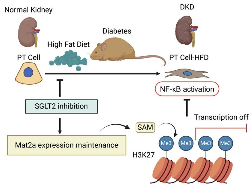 Abstract: Clinically, blockade of renal glucose resorption by sodium–glucose cotransporter 2 (SGLT2) inhibitors slows progression of kidney disease, yet the underlying mechanisms are not fully understood. We hypothesized that altered renal metabolites underlie observed kidney protection when SGLT2 function is lost. S-adenosylmethionine (SAM) levels were increased in kidneys from mice lacking SGLT2 function on a diabetogenic high-fat diet (SPHFD) compared with WT mice fed HFD. Elevated SAM in SPHFD was associated with improved kidney function and decreased expression of NF-κB pathway–related genes. Injured proximal tubular cells that emerged under HFD conditions in WT mice and humans consistently showed reduction in expression of the SAM synthetase Mat2a/MAT2A, while MAT2A inhibition, which reduces SAM production, abrogated kidney protection in SPHFD mice. Histone H3 lysine 27 (H3K27) repressive trimethylation of NF-κB–related genes was increased in SPHFD, consistent with SAM’s role as a methyl donor. Our data support a model whereby SGLT2 loss enhances SAM levels within the kidney, leading to epigenetic repression of inflammatory genes and kidney protection under metabolic stress.