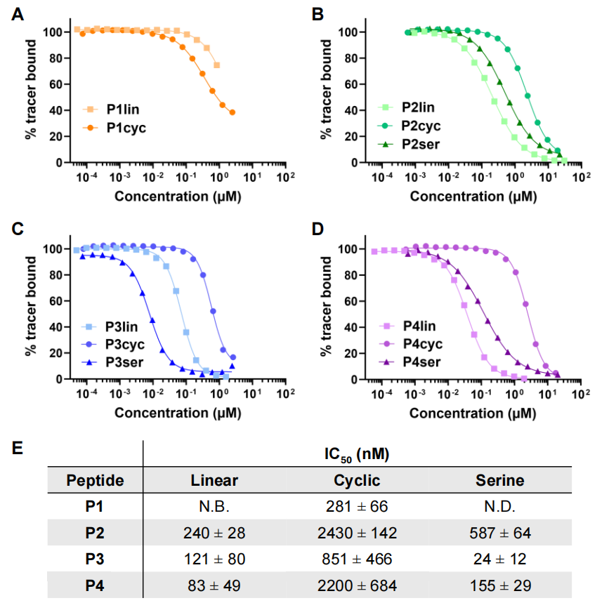 Abstract: The FANCM-RMI protein-protein interaction plays an essential role in cancers that extend their telomeres through the Alternative Lengthening of Telomeres (ALT) pathway. Here, we report the first cell-active peptide inhibitors of FANCM-RMI. Screening of mRNA-displayed peptide libraries treated with trans-1,4-dibromo-2-butene led to the discovery of both linear and cyclic peptide hits that bind RMI at the FANCM interaction site. The most potent peptides engage RMI with nanomolar affinity (KD = 4-37 nM) and outcompete the native peptide mimic of FANCM (IC50 = 24-155 nM). A bound X-ray crystal structure of the optimal peptide hit revealed novel interactions at the RMI binding site that are not found in the native interaction. Conjugation to a cell-penetrating peptide resulted in inhibitors that induced an antiproliferative effect in ALT-positive osteosarcoma cell lines. These inhibitors represent the first bioactive RMI binders that can be used as chemical tools for studying the involvement of FANCM-RMI in ALT-driven cancers.