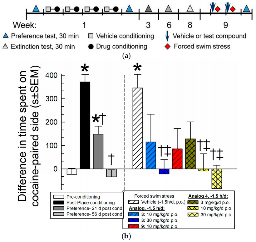 Abstract: Kappa opioid receptor (KOR) antagonists may have therapeutic potential to prevent stress-induced relapse in abstinent individuals with cocaine use disorder (CUD). The macrocyclic peptide [D-Trp]CJ-15,208 (cyclo[Phe-D-Pro-Phe-D-Trp]) is an orally bioavailable, brain–penetrant selective KOR antagonist that prevents stress-induced reinstatement of cocaine-seeking behavior in a mouse model of CUD. We synthesized and evaluated analogs of this lead compound with substitutions for the D-Trp residue to identify analogs that exhibit more potent central KOR antagonism following oral administration. The peptides were synthesized by a combination of solid phase and solution peptide synthetic methodologies, and their pharmacological activity was evaluated both in vitro (for KOR affinity, selectivity and antagonism) and in vivo (for antinociception and KOR antagonism), with promising analogs evaluated for their ability to prevent stress-induced reinstatement of cocaine-seeking behavior in the mouse conditioned place preference (CPP) assay. A variety of substituted D-Phe or modified D-Trp derivatives were tolerated by KOR with retention of significant KOR antagonism in vivo after oral administration. Macrocyclic peptide pretreatment, per os, significantly prevented stress-induced reinstatement of cocaine CPP at doses of 10 and 30 mg/kg of [D-Phe4]CJ-15,208, 4, and 30 mg/kg of [D-Trp(formamide)]CJ-15,208, 3, which are 6-fold and 2-fold lower, respectively, than that needed for {D-Trp]CJ-15,208.