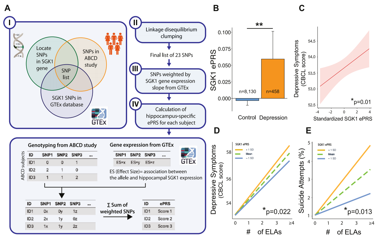 Abstract: Serum and Glucocorticoid-regulated Kinase 1 (SGK1) is elevated in hippocampal neurons following glucocorticoid exposure and in peripheral blood of depressed patients. However, its mechanistic role in psychopathology and its relevance to the human brain are unknown. To address this gap, we investigated human postmortem brain tissue and found higher SGK1 expression in the hippocampus of depressed suicide decedents compared to healthy subjects who died of natural causes. We observed the highest levels of SGK1 in subjects with reported early life adversity (ELA) – a major risk factor for psychiatric disorders. To determine potential genetic factors underlying increased SGK1 in the hippocampus, we computed expression-based polygenic risk scores (ePRS) for a large population sample from the ABCD study and found that a collection of genetic variants associated with high hippocampal SGK1 expression predicts depression severity and moderates associations between ELA, depressive symptoms, and suicide attempts. Similar to the human brain, hippocampal SGK1 expression was increased in mouse models of ELA, adult chronic stress, and chronic corticosterone exposure, and hippocampal-specific knockdown of SGK1 conferred resilience to stress-induced behavior abnormalities. To test SGK1 as a potential therapeutic target, we injected mice with the small molecule inhibitor, GSK650394, and found that pharmacological inhibition conferred stress resilience, increased adult hippocampal neurogenesis, and rescued stress-induced dentate gyrus hyperactivity. Our cross-species findings reveal a novel role for hippocampal SGK1 in stress resilience, highlight an interaction between ELA and SGK1 on depression and suicide risk, and establish for the first time a functional role for SGK1 in stress-induced psychopathology.