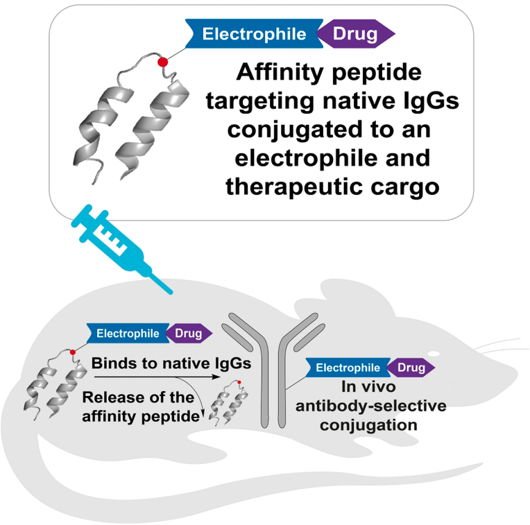 Abstract: Peptide-based therapeutics are currently in great demand but often suffer from rapid clearance and accumulation in off-target tissues, which continue to present barriers in their clinical translation. We report the development of an electrophilic peptide for the attachment of therapeutics to native immunoglobulin G (IgG) antibodies in vivo. This reactive scaffold enables the biorthogonal, selective covalent linkage of drugs of choice to circulating IgGs directly in live animals. Native IgG-selective conjugation with glucagon-like peptide-1 (GLP-1) results in sustained body weight loss and prolonged blood glucose management after one dose. This versatile technology has the potential to advance the next generation of long-acting peptide-based medicines.