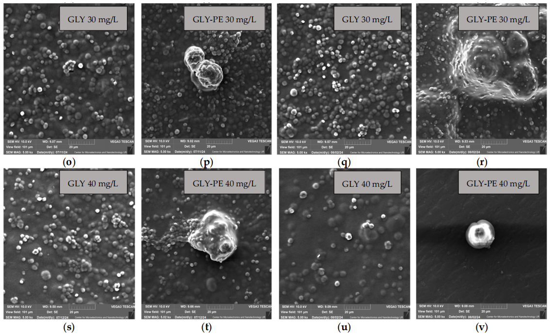 Abstract: Polyethylene microplastics (PE-MPs) and glyphosate (GLY) are widespread aquatic contaminants, but their combined effects on microalgae remain poorly understood. This study assessed the individual and joint toxicity of GLY and PE-MPs to the model microalga Chlorella vulgaris. Acute (3-day) and chronic (7-day) exposures were performed using GLY at 1–40 mg/L, alone or combined with PE-MPs (10 mg/L). A four-parameter log-logistic (4PL) model was applied to estimate median effect concentrations (EC50). After 72 h, the EC50 values were 9.77 mg/L for the GLY single system and 2.31 mg/L for the GLY-PE combined system, confirming enhanced toxicity in combined exposures. Co-exposure reduced pigment levels (chlorophyll a, chlorophyll b, and carotenoids) by up to 65% and significantly increased oxidative stress markers, including reactive oxygen species production and malondialdehyde accumulation, compared with single treatments. Antioxidant enzymes (superoxide dismutase and catalase) showed concentration- and time-dependent responses, indicating activation of cellular defense mechanisms. Scanning Electron Microscopy revealed PE-induced aggregation and structural damage to algal cells, particularly at higher GLY concentrations. These findings demonstrate that PE-MPs can amplify the toxic effects of GLY on microalgae and highlight the need for further studies at environmentally relevant concentrations and with different polymer types.