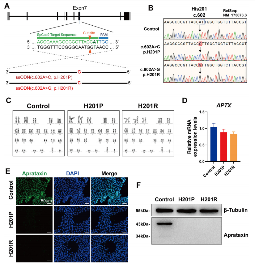 Abstract: Ataxia with oculomotor apraxia type 1 (AOA1) is a rare, autosomal recessive, early-onset, progressive cerebellar ataxia caused by mutations in the APTX gene, which encodes aprataxin, a DNA-adenylate hydrolase involved in DNA damage repair. The pathogenesis of AOA1 remains unclear. The purpose of this study was to investigate the pathogenesis of a novel mutation, p.H201P/H201R, carried by our AOA1 patient and the mechanism of AOA1 in an induced pluripotent stem cells (iPSCs) model. We edited iPSCs derived from a healthy individual to carry the APTX homozygous mutation p.H201P (H201P-iPSCs) or p.H201R (H201R-iPSCs) via CRISPR/Cas9. We found that aprataxin expression was absent in both H201P- and H201R-iPSCs. The capacity of these APTX-mutant iPSCs to differentiate into neural progenitor cells (NPCs) and mature neurons was diminished. We observed an increase in DNA single-strand breaks (SSB) via a comet assay and poly(ADP-ribose) staining, and an increase in the ratio of cleaved PARP-1/total PARP-1 in APTX-mutant NPCs and early immature neurons (EiNs), in addition of a heightened sensitivity to tert-butyl hydroperoxide in APTX-mutant EiNs. Moreover, a decrease of APE1 expression was observed in APTX-mutant NPCs and H201R-EiNs during neural differentiation. Our study established a practical iPSCs model to investigate AOA1 disease. We found that mutant aprataxin leads to defective neural differentiation, accompanied by the accumulation of DNA SSBs with increased cleaved PARP-1 and reduced APE1 expression of the base excision repair pathway.