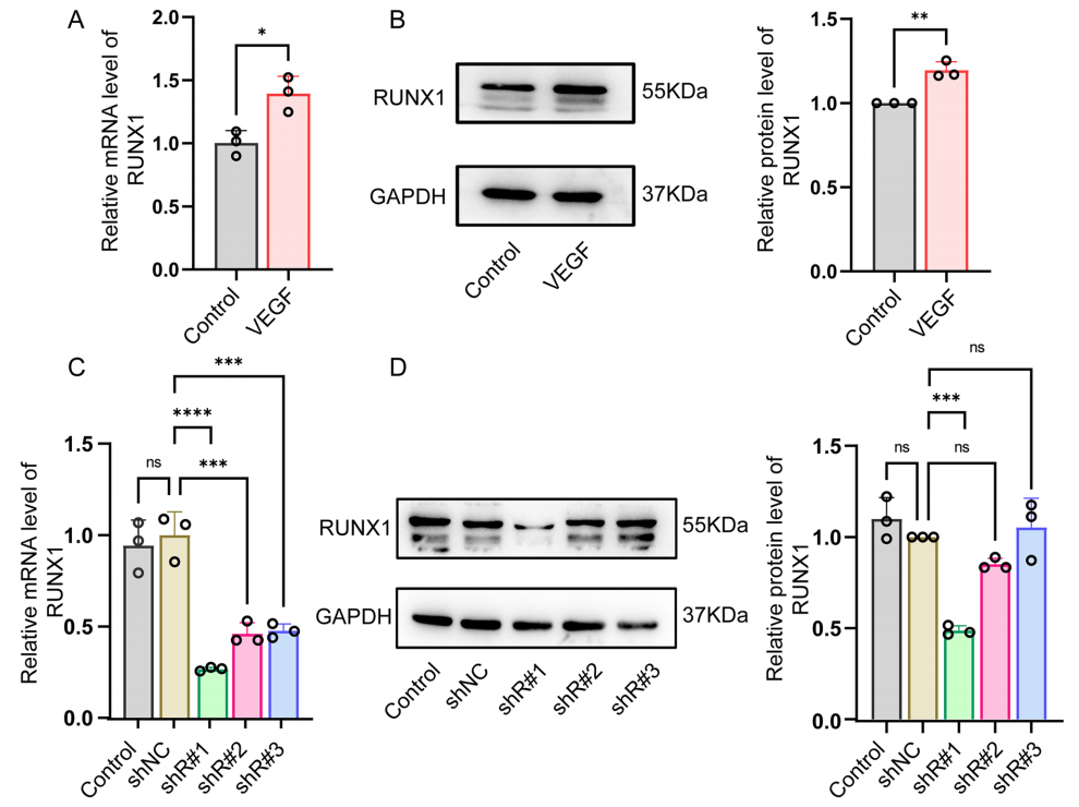 Abstract: Purpose: This study aimed to elucidate the regulatory role of Runt-related transcription factor 1 (RUNX1) in corneal neovascularization (CoNV) and its possible mechanisms. Methods: In VEGF-induced human umbilical vein endothelial cells (HUVECs), lentiviral vectors were used to knock down or overexpress RUNX1, and plasmid transfection was employed to knock down P300. EdU assay, Transwell assay, and tube formation assay were conducted to assess cell proliferation, migration, and tube formation ability, respectively. Chromatin immunoprecipitation, followed by quantitative PCR, was performed to verify the binding of P300 and RUNX1. Co-immunoprecipitation was carried out to detect the formation of the RUNX1-P62 complex. Autophagic flux was monitored by using RFP-GFP-LC3 tandem fluorescence reporters. For in vivo validation, a rat model of corneal neovascularization was established by alkali burn induction. The expression of RUNX1 was verified by quantitative real-time PCR and Western blotting. Short hairpin RNA targeting RUNX1 was injected subconjunctivally into alkali-burned rats, and the area of corneal neovascularization and pathological changes were observed. Western blotting and immunofluorescence were used to detect the expression of relevant proteins. Results: The results showed that in the context of CoNV and VEGF-induced HUVECs, the autophagy signaling pathway is inhibited, while the levels of RUNX1 and P300 are significantly increased. Overexpression of RUNX1 reverses the inhibitory effect of P300 silencing on angiogenesis. P300 binds to a specific regulatory element in the RUNX1 promoter, thereby facilitating RUNX1 transcription. Notably, silencing RUNX1 can attenuate the stimulatory effects of VEGF on the proliferation, migration, and tube formation of HUVECs by activating autophagy. Conclusions: P300 binds to the RUNX1 promoter to enhance its transcription, and RUNX1 subsequently regulates autophagy-related genes to influence CoNV progression.