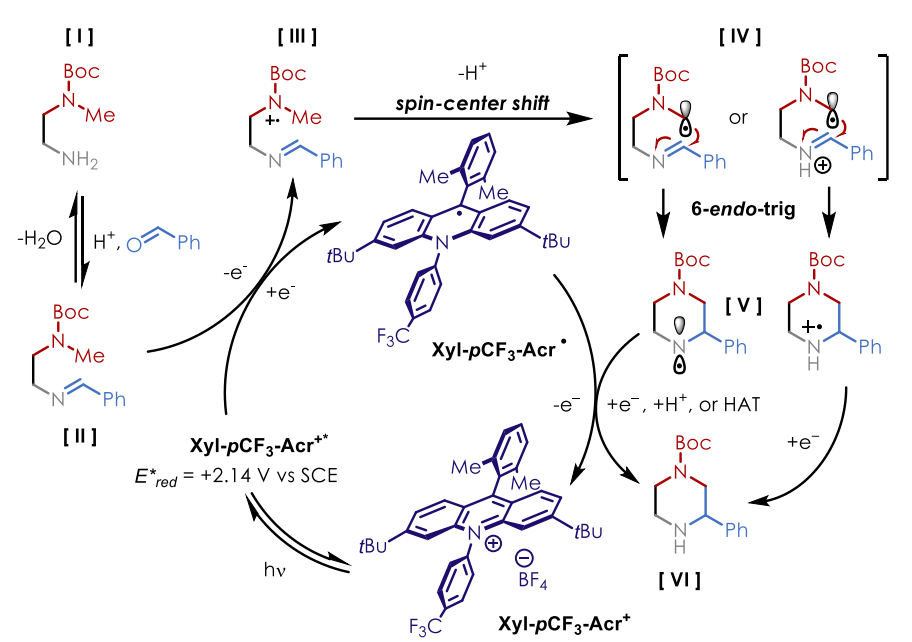 Abstract: The selective and facile functionalization of C-H bonds - the most abundant bonds in all chemical space - remains a key driving factor for innovation in modern chemistry. Chapter 1 provides an overview of C-H functionalization research and its importance; discussion of C-H functionalization necessitates an analysis of subjects such as organometallic chemistry, radical generation and functionalization, and the synthetic benefits and challenges presented therein. Intersecting with discussion of C-H functionalization and radical chemistry, photoredox catalysis has played a major role in modern C-H functionalization methodologies, and as such is discussed in detail. Distinct and impactful C-H functionalization works from the Nicewicz lab are explored, providing a basis for the exploratory photoredox catalysis chemistry discussed in subsequent chapters. Chapter 2 explores attempts at generating and functionalizing azaallyl radical species via organic photoredox catalysis. Using the extreme oxidizing power of acridinium photoredox catalysts for novel modes of C-H functionalization circumvents the typically harsh conditions needed for azaallyl radical formation. While methods for α-amino functionalization are abundant, azaallyl radicals are uniquely long-lived, allowing for radical cascade and cyclization reactivity. While some success was afforded C-H functionalization with typical radical traps, control of the reactivity remains tenuous and the desired cascade-like cyclization remains elusive. Chapter 3 details a completed C-H functionalization methodology for the programmable synthesis of decorated piperazine cores via organic photoredox catalysis. The synthetic and medicinal importance piperazines is highlighted, as are the typical shortcomings of both traditional and state-of-the-art approaches for their synthesis. Optimization and scope of the cyclization reaction are explored in depth, and a complementary hydroamination strategy for the synthesis of complex diamine backbones from enecarbamates via organic photoredox catalysis is demonstrated. Chapter 4 serves as a conceptual successor to the piperazine methodology, establishing the foundation of a synthetic approach for an organic photoredox-catalyzed morpholine synthesis via a C-H functionalization strategy. Initial optimization of the desired reactivity is detailed in full, exploring somewhat divergent results based on seemingly innocuous changes to the reaction system. While the yield in either iteration of the model system remains low, significant options for future optimization remain in terms of catalyst choice and substrate design.