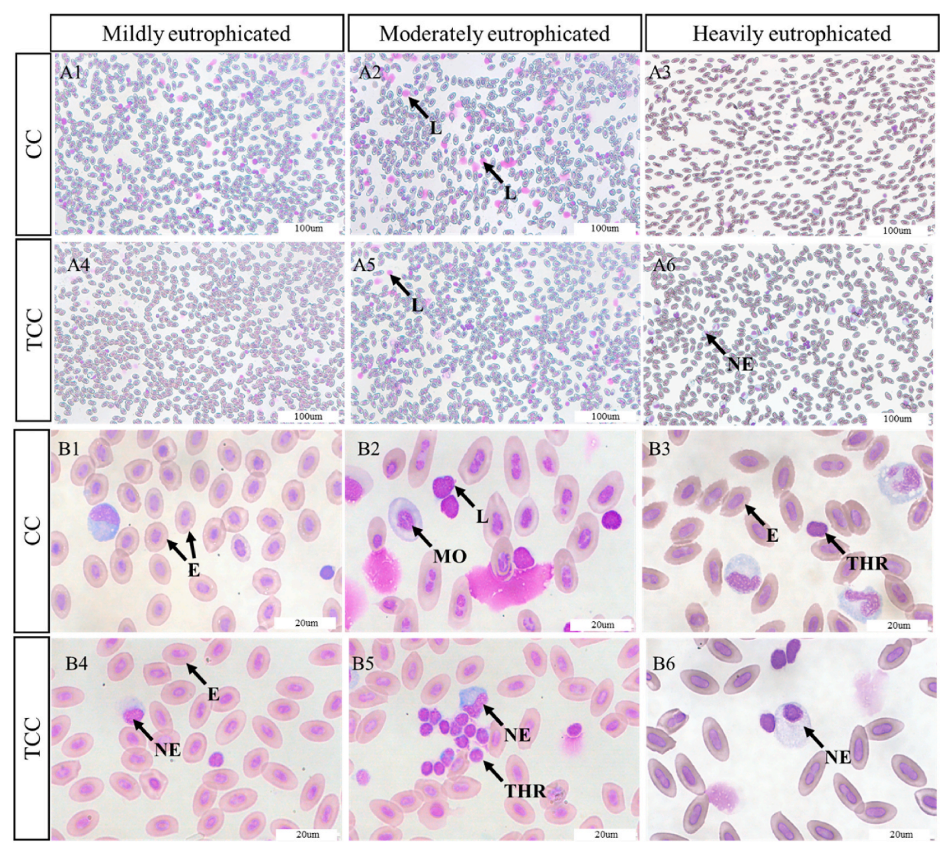 Abstract: Eutrophication significantly impacts on aquatic ecosystems. The accumulation of nutrients such as nitrogen and phosphorus in water bodies leads to a series of ecological problems, including water quality deterioration, reduced dissolved oxygen levels, and decreased transparency. These issues significantly impact the physical and chemical properties of water bodies, the diversity of aquatic organisms, community structure, and ecological functions. Carassius cuvieri (CC) and Triploid Crucian carp No. 2 (TCC) are common freshwater aquaculture fish species with extensive farming foundations and economic value. Their survival and growth are closely tied to environment conditions. This study uses CC and Triploid TCC as research subjects, conducting a 30-day eutrophication aquaculture experiment in a mildly eutrophic water body (TN: 0.868 mg/L; TP: 0 mg/L) as the initial environment. Combining morphological, histological, transcriptomic, inhibitor-treatment, and qRT-PCR techniques, we explored the molecular mechanisms underlying the adaptation of crucian carp to eutrophication environments. The results showed that, as the degree of eutrophication increased, growth indices of both CC and TCC were affected to varying degrees. Peripheral blood cell and histological section observations revealed abnormal blood cell morphology, increased white blood cell counts, nuclear displacement and aggregation in hepatocytes, curved and thinned gill filaments, and broken and damaged gill filaments in both fish species; High-throughput sequencing results showed that differentially expressed genes in liver tissue were primarily enriched in immune-mediated infectious-diseases, lipid-metabolism, and signal -transduction pathways. mRNA expression analysis of crucian carp embryos treated with the TLR5 inhibitor TH1020 suggested that changes in certain genes within the TLRs signaling pathway may be associated with the activation of downstream cascades and the secretion of pro-inflammatory cytokines, collectively facilitating fish adaptation eutrophication. This study provides scientific experimental evidence for optimising large-scale fish farming models, monitoring of aquaculture environmental quality, and maintaining the balance of aquatic ecosystems. TCC copes better with eutrophication through stronger antioxidant and immune responses, whereas CC shows more pronounced gill and liver damage.