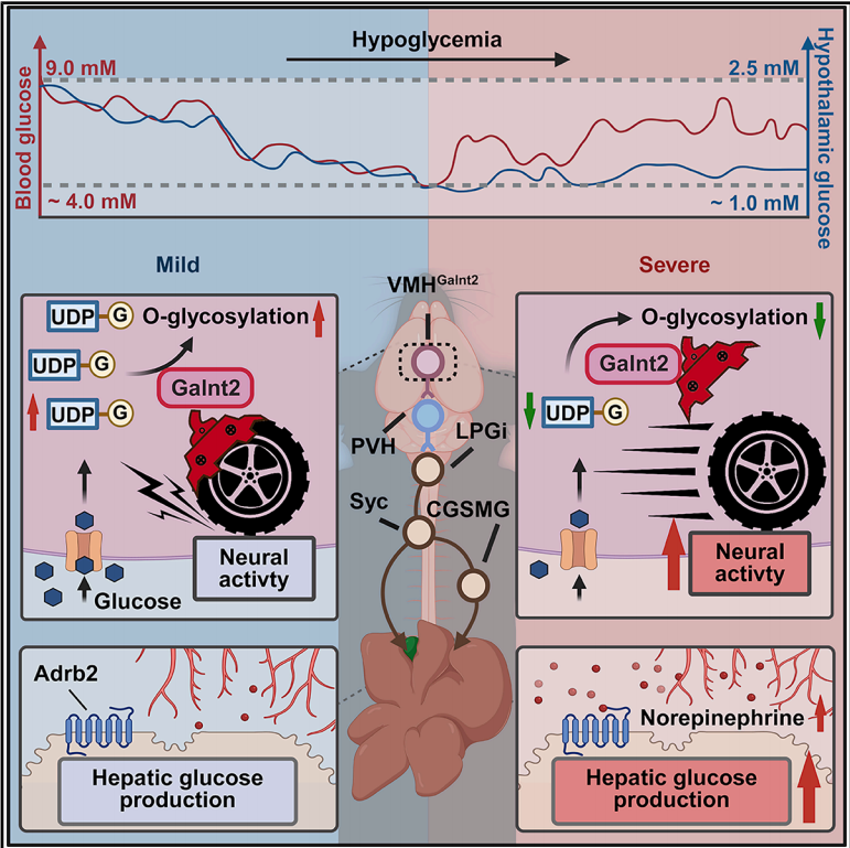 Abstract: The brain relies heavily on glucose for energy resources, and thus prompt counterregulatory responses to hypoglycemia in connection with glucose production are fundamental. We identified a biphasic pattern in blood and hypothalamic glucose dynamics during prolonged fasting, revealing an additional threshold-dependent mechanism for counterregulation. This mechanism is mediated by a ventromedial hypothalamus (VMH)→paraventricular hypothalamic nucleus (PVH)→lateral paragigantocellular nucleus (LPGi)→liver neurocircuit that detects neuroglycopenia and transmits neural signals to drive hepatic glucose production via intrahepatic sympathetic activation. Using viral tracing, single-nucleus RNA sequencing, and various unbiased methods, we identified Galnt2 as both a genetic marker and molecular brake of VMH glucose-inhibited neurons, modulating the glycemic threshold for hypoglycemia perception and metabolic homeostasis. Our results highlight a VMHGalnt2-originated brain-liver neurocircuit that perceives and counterregulates hypoglycemia and may pave the way to innovative therapeutic strategies against metabolic disorders characterized by glucose dysregulation.