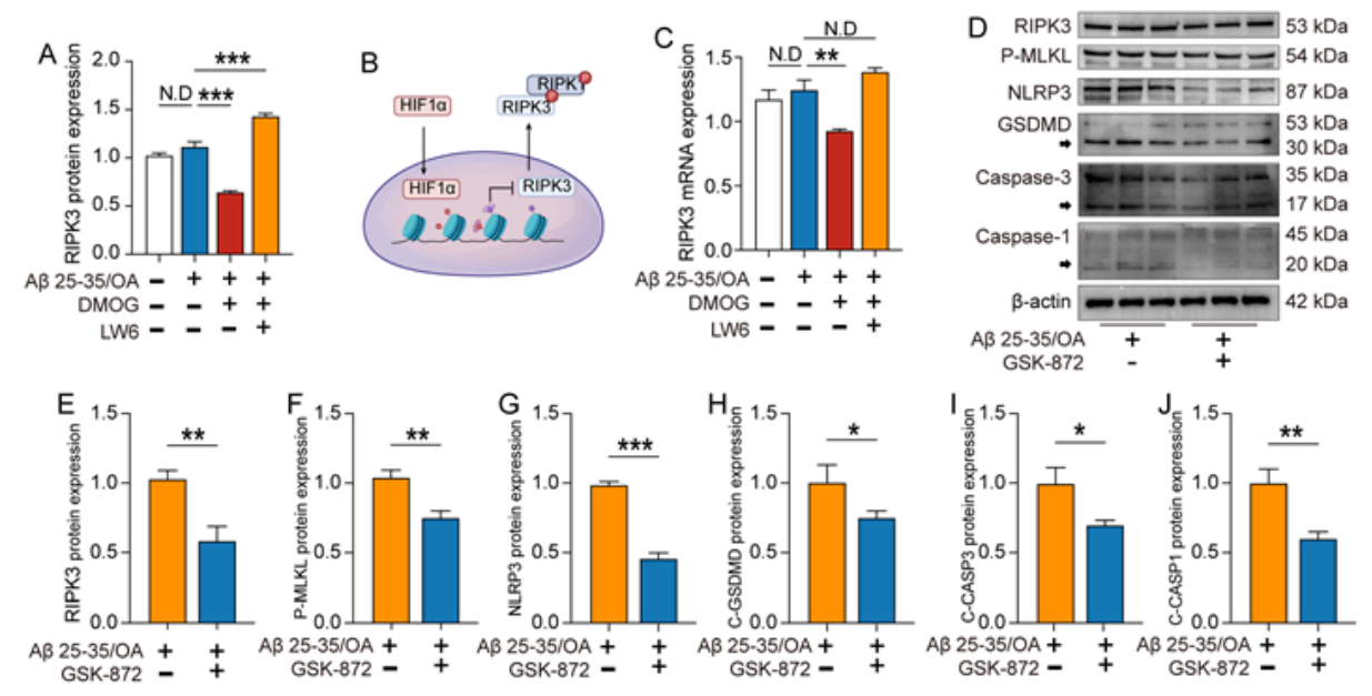 Abstract: Extensive neuronal loss in brain regions critical for learning and memory is a hallmark of Alzheimer's disease (AD). PANoptosis, a newly characterized form of programmed cell death, integrates the key features of pyroptosis, apoptosis and necroptosis, and explains the molecular crosstalk among these pathways. However, whether PANoptosis is a new manner for hippocampal neuron death in AD, and the involved regulatory mechanisms remains largely unknown. Here, we demonstrate that PANoptosis is a crucial mechanism driving hippocampal neuronal loss in an AD mouse model. Moreover, we uncovered that the HIF-1α signaling pathway exerts adouble-edged sword effect on hippocampal neuronal PANoptosis by activating the HK2/VDAC1/NLRP3 axis while concurrently suppressing RIPK3signal. This observation may offer a partial explanation for the double-edged sword role of HIF-1α as both a neuroprotective and neurotoxic factor in AD. Finally, we uncovered that semaglutide, a glucagon-like peptide-1 receptor agonist (GLP-1RA) currently undergoing phase 3 clinical trials for AD, mitigates hippocampal neuronal PANoptosis by upregulating HIF-1α expression while suppressing its downstream HK2/VDAC1/NLRP3 axis and RIPK3 signal, highlighting its potential as a therapeutic avenue for AD. These findings uncover a previously unrecognized role of PANoptosis in AD and provide new insights into the HIF-1α-mediated regulatory mechanisms, offering a promising target for therapeutic intervention.
