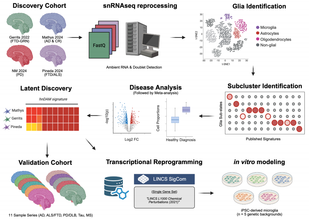 Abstract: Disease-associated glia represent plastic transcriptional cellular states observed across neurodegenerative diseases (NDDs). In particular, microglial states have been characterized in Alzheimer’s disease and mouse models of amyloidosis. Although single-cell transcriptomic technologies have increased the dimensionality of information available across cell states, few studies have systematically tested for changes in glial transcription across brain regions and disease states. Here, we report a statistical framework for glial annotation, disease association, and transcriptional profiling, which facilitate identification of generalizable glial states that are present across a spectrum of NDDs (Alzheimer’s disease, Parkinson’s disease, Amyotrophic Lateral Sclerosis, and Frontotemporal dementia). We identify seven astrocyte substates, 14 microglia/myeloid substates, and five oligodendrocyte substates where transcriptional variability is attributable to region, disease, or batch effects. Regional heterogeneity of astrocytes masked disease associations, even within cortical astrocytes. We found only limited oligodendrocyte transcriptional heterogeneity, resulting in few substates for further interrogation. Notably, microglia showed the strongest evidence for disease association. We show, for the first time, that this association exists across the entire NDD spectrum. Using latent factor analysis, we created a consensus human neurodegenerative disease-associated microglia (hnDAM) signature, which we experimentally validated in 11 independent sample series. We demonstrate that the hnDAM signature is a statistically testable biomarker for conserved microglial activation in NDDs by: i) comparing to murine DAM-like signatures, ii) performing transcription factor analysis, and iii) modeling transcriptional reprogramming perturbations in iPSC-derived microglia. Taken together, this work broadens our understanding of glial activation across neuropathologies and reveals hnDAM as a putative therapeutic target that can be widely generalized to patients suffering from NDDs.